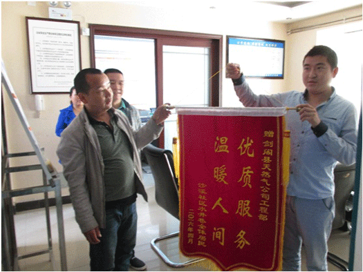 4月28日上午,劍閣縣下寺鎮(zhèn)水井巷沙溪社區(qū)六組天然氣用戶來我劍閣分公司,贈廣元市天然氣公司劍閣分公司工程部 “優(yōu)質(zhì)服務(wù)、溫暖人間” 錦旗一面。