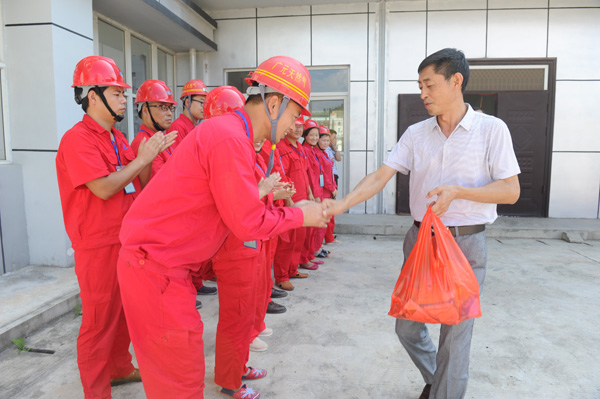 ??? 8月12日,市總工會許明峰副主席一行在公司副總經(jīng)理茍建華、工會主席余杰的陪同下來到公司西門配氣站,看望慰問一線職工,為他們送去了毛巾、洗衣粉、藿香正氣口服液、花露水、白糖等防暑降溫用品。