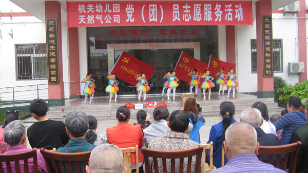 ??? 昭化分公司的團員聯(lián)合當?shù)貦C關(guān)幼兒院的青年來到昭化養(yǎng)老院看望了該院24位殘疾孤寡老人。他們?yōu)槔先藗冎v解了安全用氣常識并送上毛巾、香皂等生活用品,幼兒院活潑可愛的小朋友為老人們表演了精彩的舞蹈,養(yǎng)老院洋溢著愉快的節(jié)日氣氛。