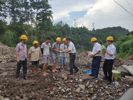 圖為楊俊良副書記在管線穿河項(xiàng)目施工現(xiàn)場為施工工人送清涼