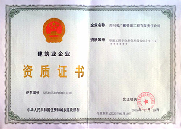 ??? 7月16日,經(jīng)四川省住房和城鄉(xiāng)建設(shè)廳核準(zhǔn),四川省廣燃管道工程有限責(zé)任公司取得建筑施工《安全生產(chǎn)許可證》,自2015年1月和4月該公司分別取得《建筑業(yè)企業(yè)管道工程專業(yè)承包叁級(jí)資質(zhì)》、中華人民共和國(guó)《特種設(shè)備安裝改造維修許可證(壓力管道)GA1乙級(jí)、GB1(含PE專項(xiàng))》資質(zhì)。在該公司成立一周年之際,四川省廣燃管道工程有限責(zé)任公司已具備壓力管道安裝資格,對(duì)于公司拓展市場(chǎng)開展業(yè)務(wù)具有重要戰(zhàn)略意義。