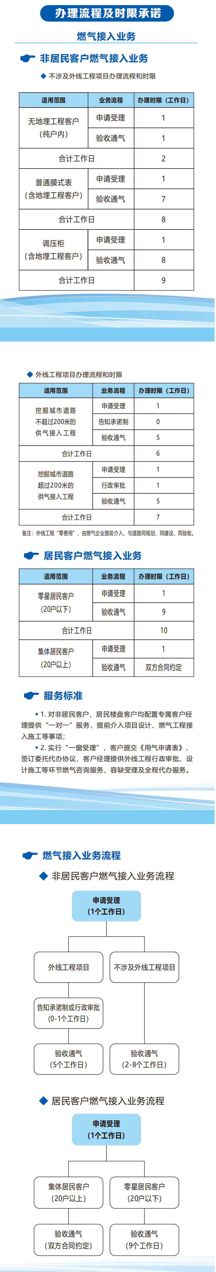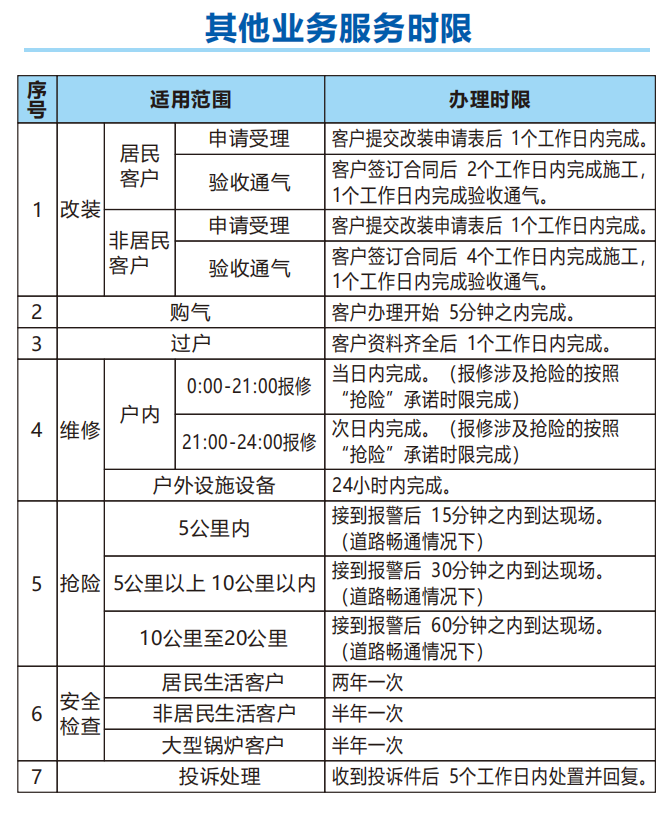 二、公開天然氣業(yè)務(wù)辦理流程、服務(wù)承諾及收費(fèi)標(biāo)準(zhǔn)。